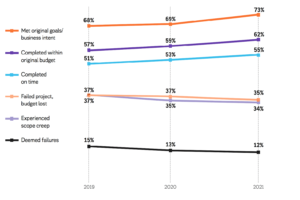در سالهای اخیر نیز روند موفقیت پروژهها بهطور قابل ملاحظهای بهبود نیافته است: در سطح جهانی، حدود ۳۵٪ از پروژهها شکست خورده یا بودجهشان از بین رفته، ۳۴٪ دچار افزایش دامنه شدهاند، و تقریباً ۱۲٪ کاملاً ناموفق بودهاند (نمودار۱- PMI, 2021b).